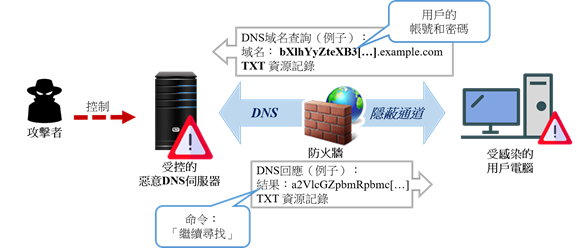 DNS通道穿越是指控制域名和DNS伺服器,對DNS域名查詢和回應內的數據進行編碼,與受控/受感染的DNS伺服器和用戶電腦進行通訊。DNS通道穿越攻擊利用向攻擊者的伺服器發出的正常DNS域名查詢,為攻擊者提供隱蔽的指令和控制通道,並通過指令和控制(Command and Control,簡稱C&C)方法提供數據外泄的路徑。外泄的數據會隨着時間被編碼到多個DNS主域名查詢中,從而逐步外泄敏感資料。