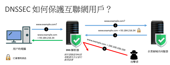 域名系統安全擴展(DNSSEC)在搜尋IP地址時驗證域名的DNS數據,從而提高安全水平。DNSSEC利用加密簽署技術確認所收到的DNS數據是真確的。DNSSEC有助確保數據的完整性,以及認證DNS數據的源頭,從而可在DNS層面防止攻擊者把用戶轉接至偽冒網站。不過,要注意有關域名需要啓用DNSSEC和DNS解析器需支援DNSSEC,以提供有關保護。